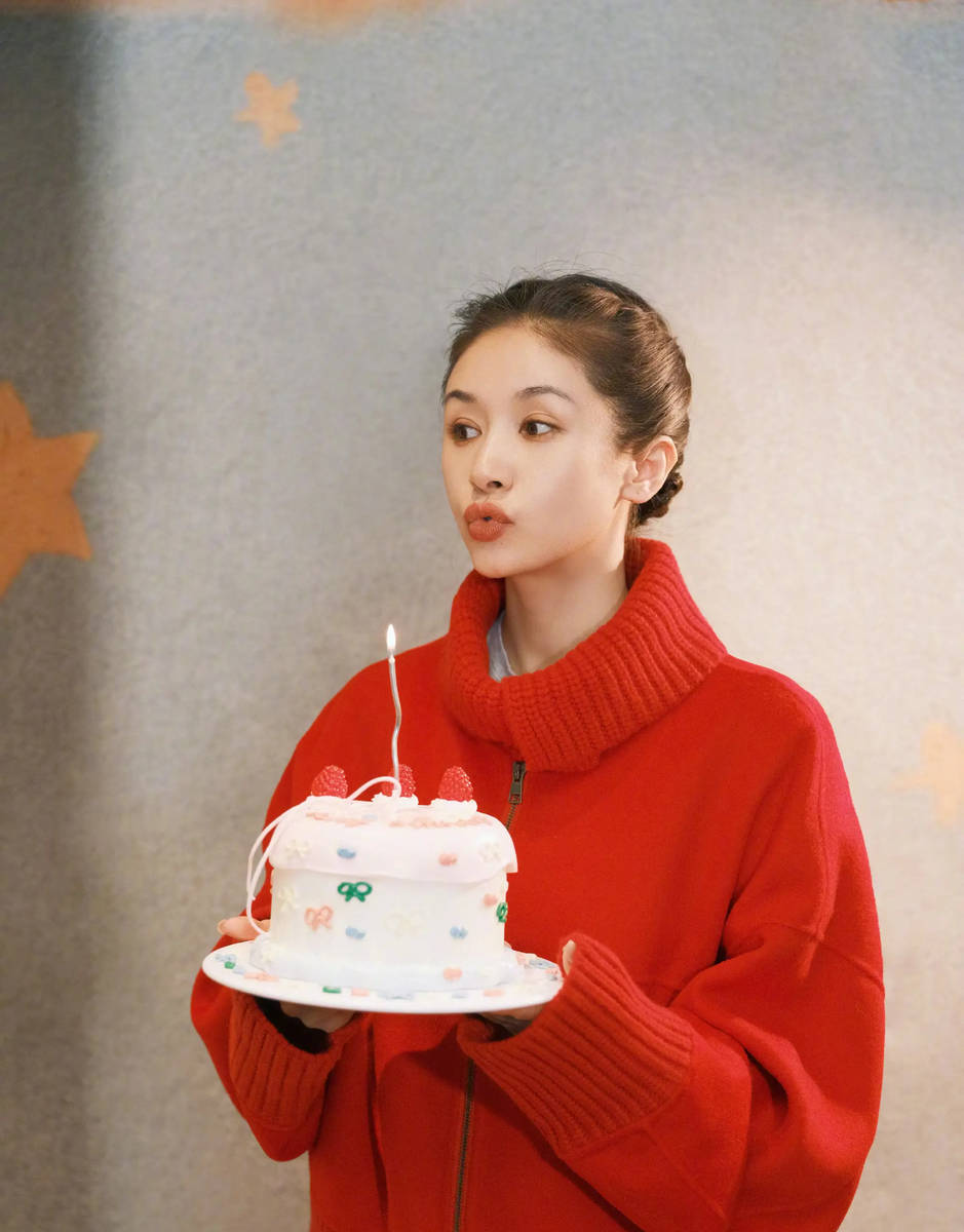 穿搭细节处处彰显巧思,红高领毛衣的版型简约利落,没有多余的装饰,仅靠细腻的针织纹理与亮眼的色调撑起质感,搭配一条简约的深色下装,既平衡了正红色的艳丽,又凸显出整体造型的层次感,简约却不普通。发型上,她选择利落的低盘发,将发丝整齐盘起,露出流畅的额头与精致的五官,发间点缀的星星装饰小巧精致,与手中的生日蛋糕相互呼应,增添了几分俏皮感与仪式感。